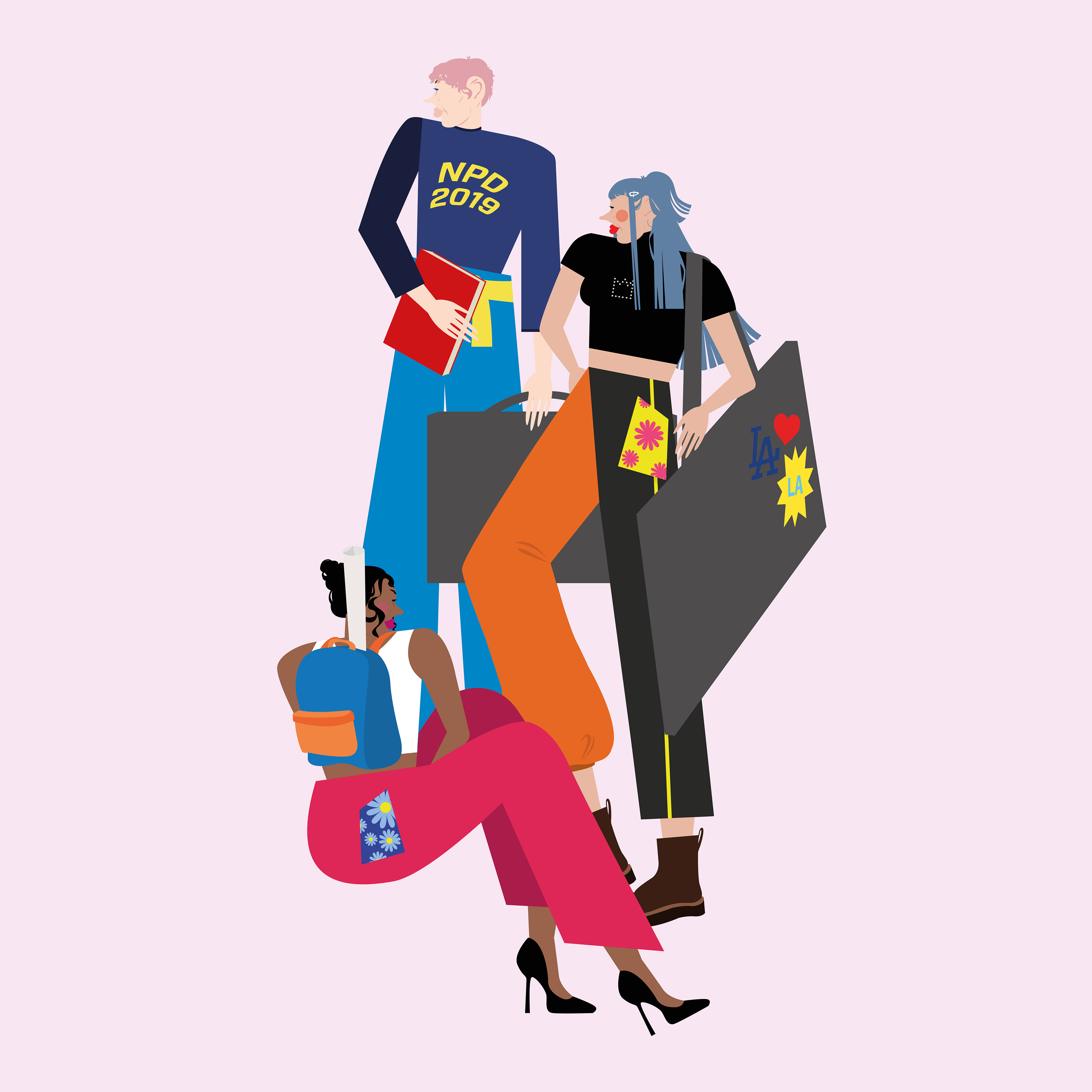 ✐✎✐ BI illustration design for the 2019 National Portfolio Day Los Angeles @Otis College of Art and Design. When entering college, a large number of students start expressing who they are through outfits, through their looks. This illustration was inspired by those students.
